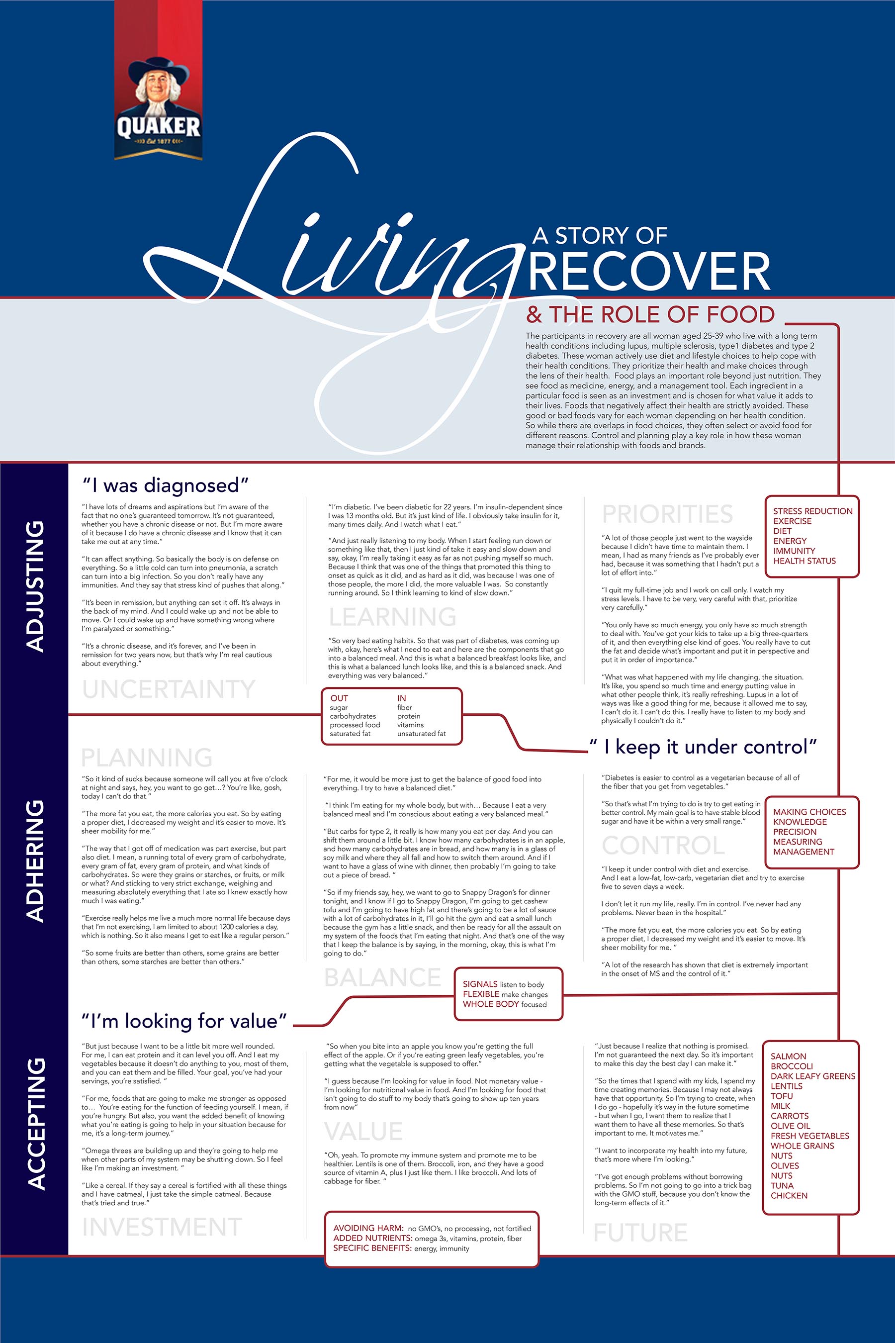 This communication design class project looked at data gathered from focus group whose participants were living with a chronic disease. It focused on the role of food in there lives. I examined the data with the client Quaker in mind.